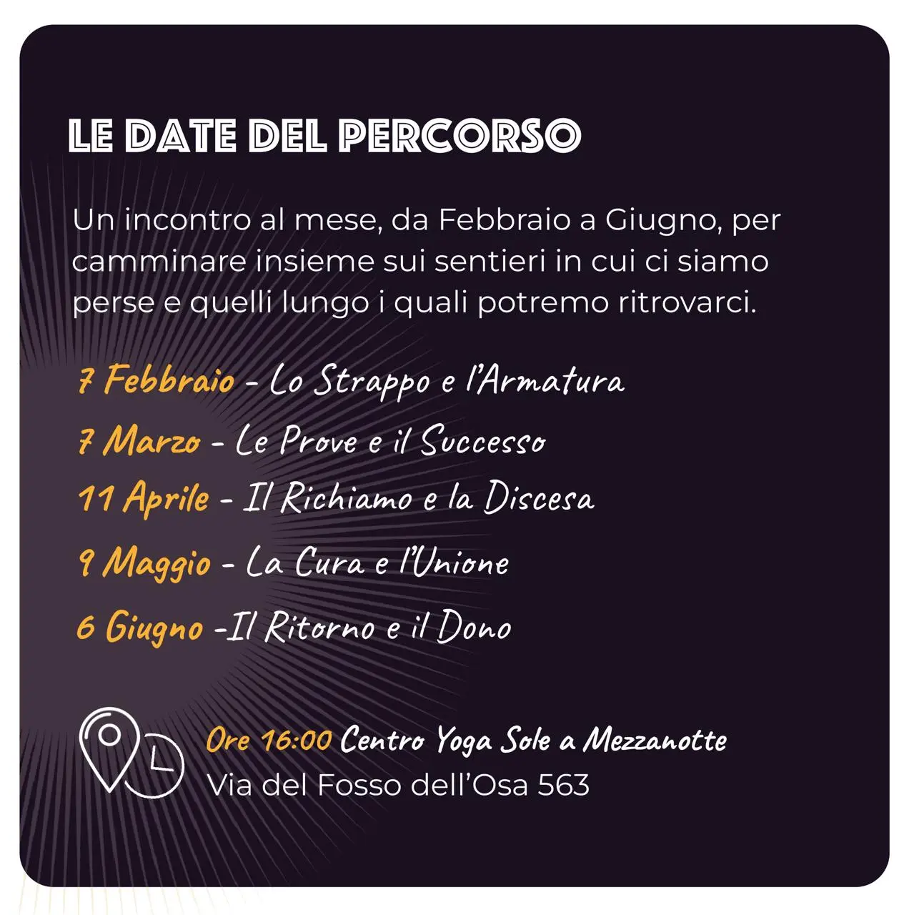 Il Viaggio della Dea è pensato come un cammino condiviso articolato in 10 tappe, distribuite in 5 incontri in presenza, accompagnati da materiali, spunti di riflessione e occasioni di confronto in un gruppo WhatsApp che accompagna il lavoro durante il mese.